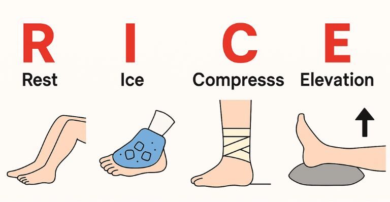 次に、急性期にはアイシング、圧迫、挙上を基本としたRICE処置を行い、炎症と腫脹を早期に抑えます
