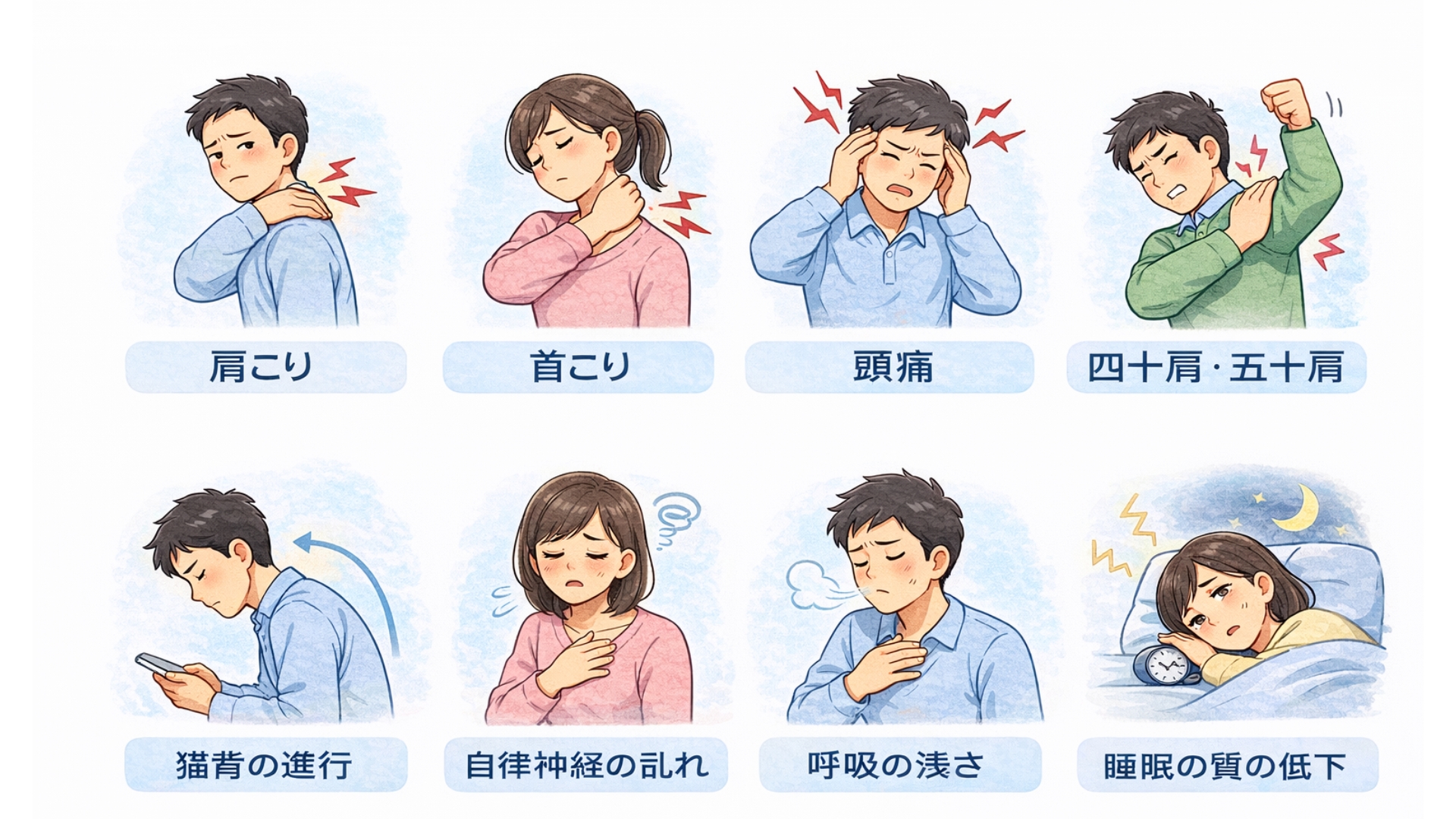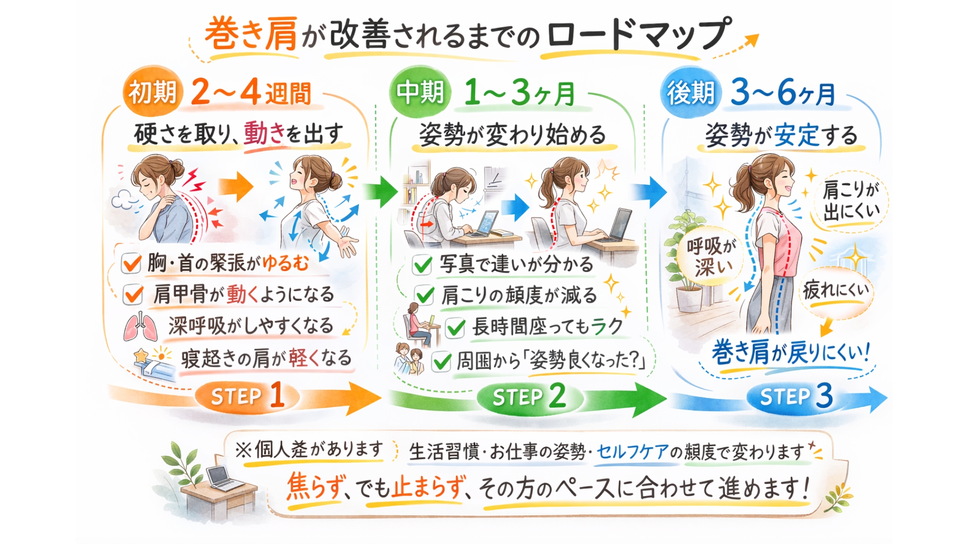 硬くなった胸の筋肉をゆるめ、弱くなった背中を鍛え、正しい姿勢を身体に覚えさせることで少しずつ変化します。