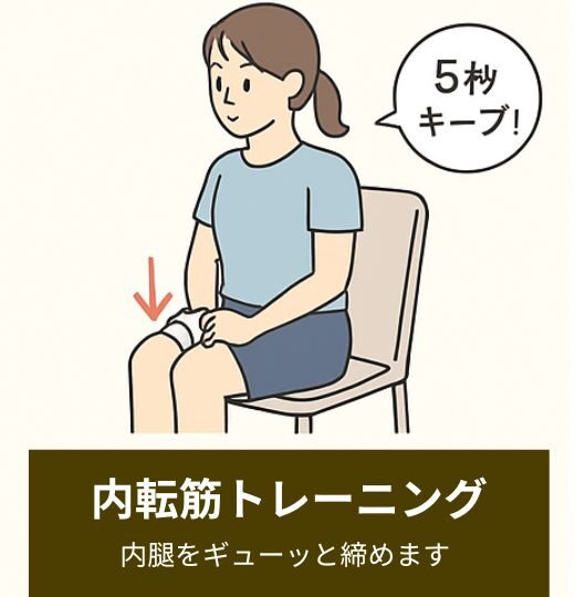 弱くなった内ももの筋肉(内転筋群)を鍛え、膝が内側へ寄る力を強化します。