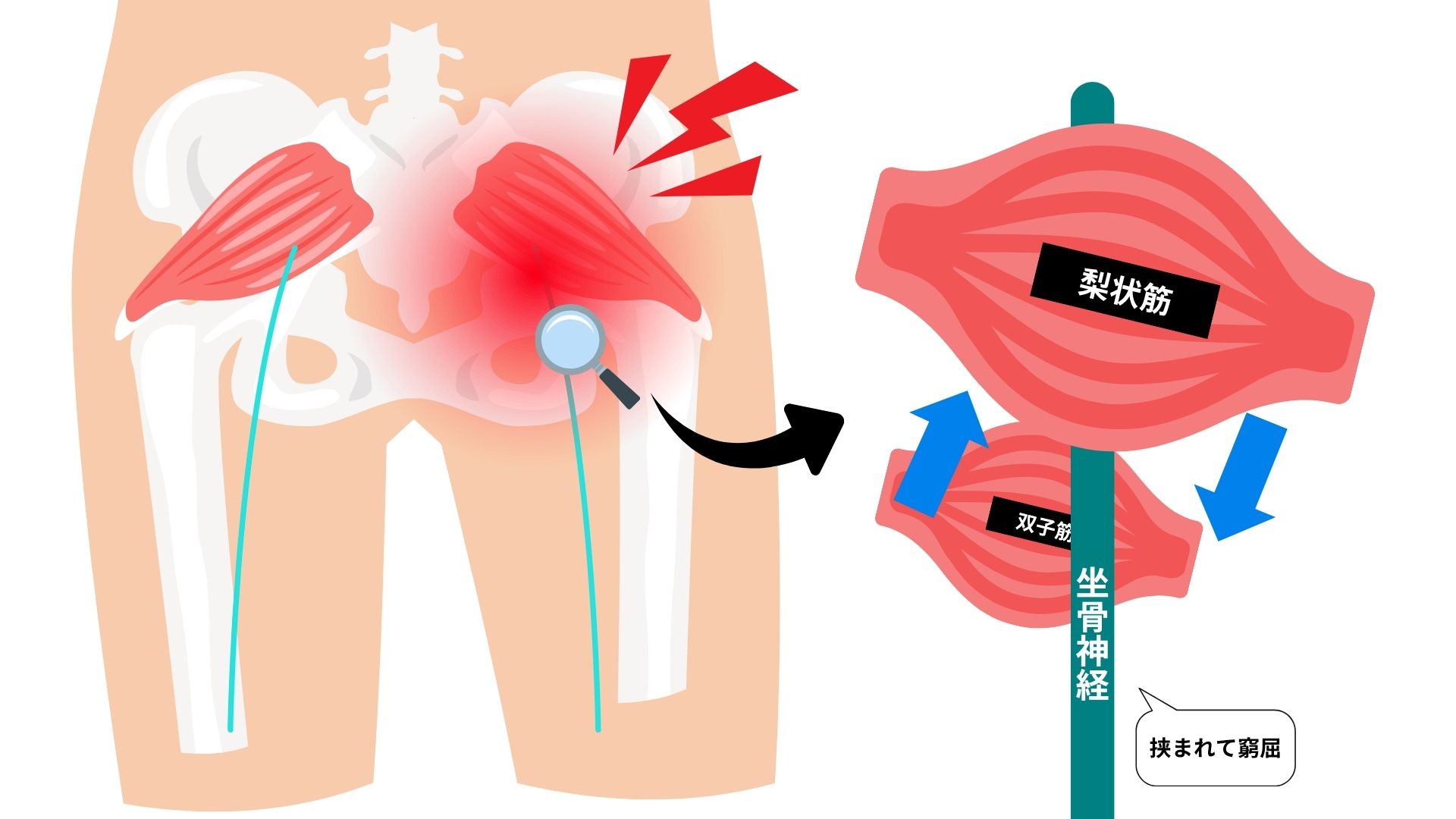 梨状筋症候群は、お尻の深い部分にある梨状筋が硬くなり、すぐ下を通る坐骨神経を圧迫することで、さまざまな症状を引き起こします。