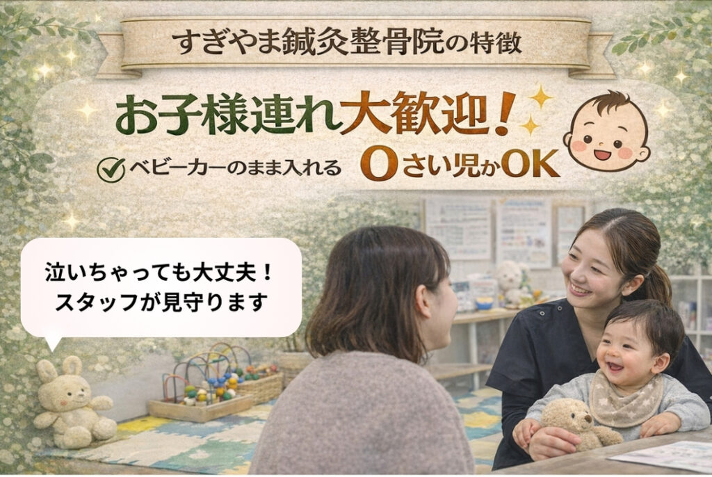 むしろ「何十回も通わなければ整わない矯正」は、あなたの時間も体も疲弊させてしまうかもしれません。上尾市-久喜市-さいたま市北区土呂/宮原すぎやま鍼灸整骨院では、忙しいママたちが無理なく通えて、しっかり効果を感じられることを第一に考えています。