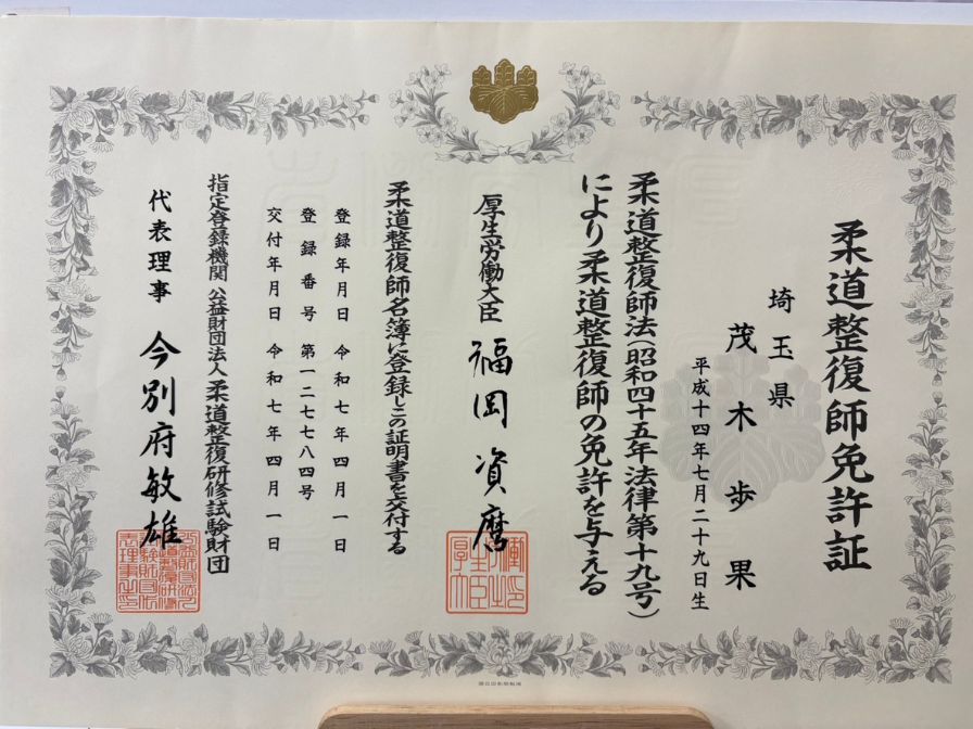 2025年4月からすぎやま鍼灸整骨院に入社しました、柔道整復師の茂木歩果(もてき ほのか)です。生まれも育ちもさいたま市で、幼い頃から身体を動かすことが好きでした。中学・高校では女子サッカー部に所属し、勝ちにこだわりながら仲間と全力で取り組んできました。この経験から、努力を続けることやチームワークの大切さを学びました。学生時代から接骨院が身近な存在だったこともあり、「人を助けられる仕事がしたい」と思い柔道整復師の道へ進みました。帝京平成大学では、施術技術だけでなくトレーニング指導やケガ予防、コンディショニングについても学び、国家資格を取得しました。当院の「患者様の痛みや悩みに最後まで寄り添う姿勢」に共感し入社を決意しました。施術では、ただ優しく寄り添うだけでなく