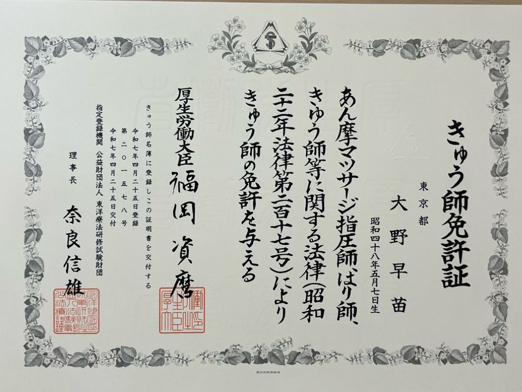 これからは鍼灸師として、患者様の身体と心に寄り添い、健康で快適な毎日を支える存在を目指します。どうぞよろしくお願いいたします。