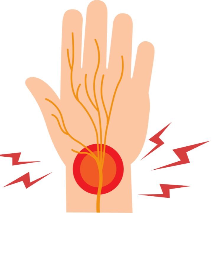 このトンネルがむくみや変性で狭くなると、神経が締めつけられしびれが起きます。特に朝に起きやすく、痺れで目が覚めてしまう方もいます。また、手を振ると楽になる(フリックサイン)という特徴もあります。