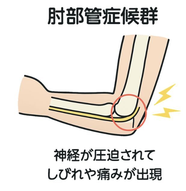 肘の内側を通る「尺骨神経」が、骨と靭帯の間のトンネル(肘部管)で圧迫されて起こります。手のひらの小指側に痺れが出やすく、指を開く・閉じる動きがやりにくくなります。