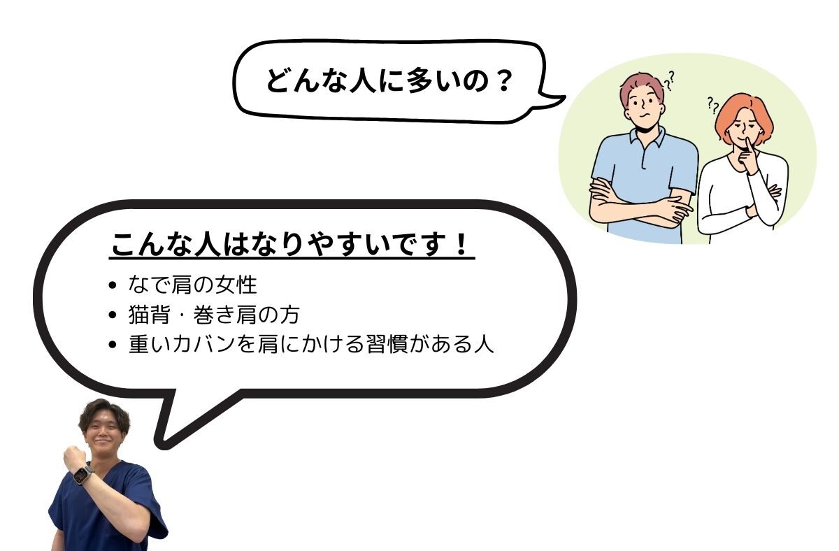 また、なで肩の場合神経が下方に引っ張られてしまうことでも胸郭出口症候群を引き起こすことがあります。