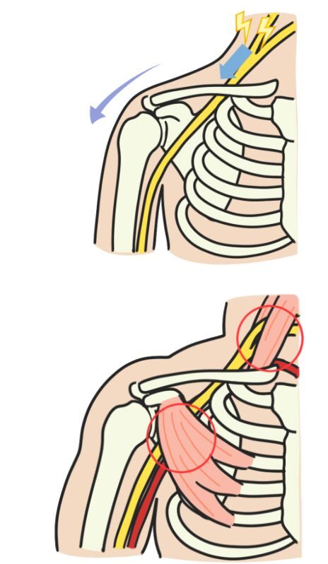 神経そのものに異常がなくても、その周囲の筋肉(特に首・肩・肩甲骨まわり)が固くなると、神経を物理的に圧迫してしまいます。そのため、肩を押した際響くように痺れることがあります。