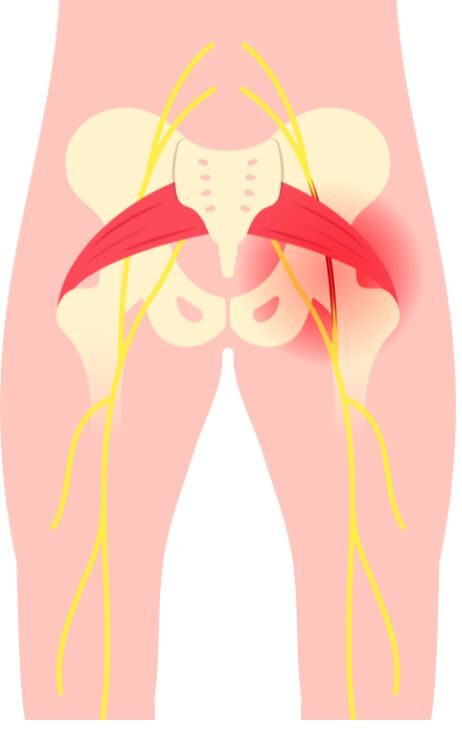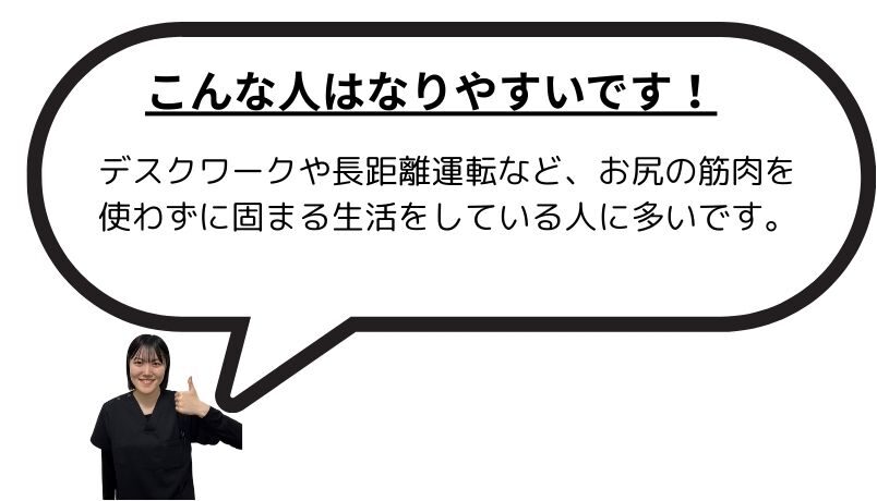 お尻の深い部分にある「梨状筋」という筋肉が硬くなると、そのすぐ下を通っている坐骨神経を圧迫してしまいます。お尻の中心がズーンと痛み、長時間座っているとしびれが強くなる。