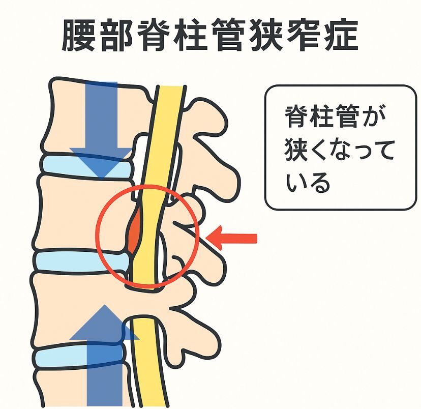 加齢や姿勢の悪化により、このトンネルが狭くなると、中の神経が締めつけられてしびれが出ます。特徴として、お尻や足にジーンとしたしびれが出たり、力が入りにくくなります。