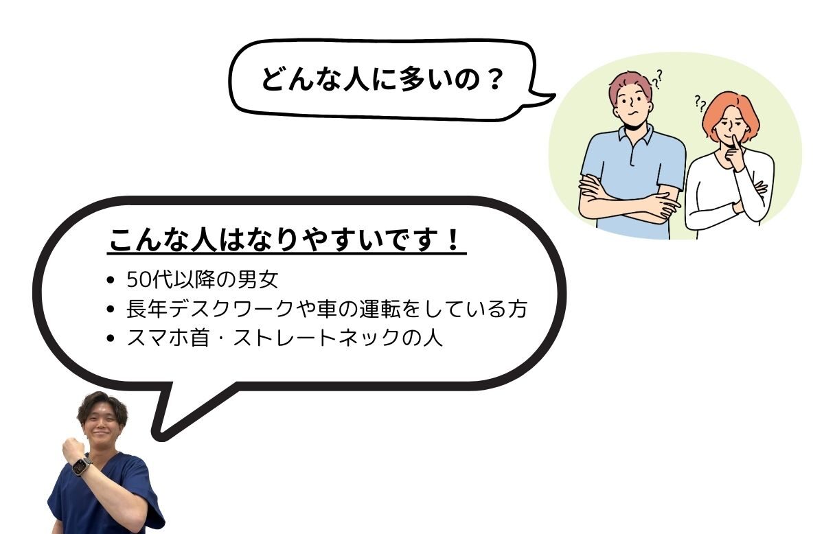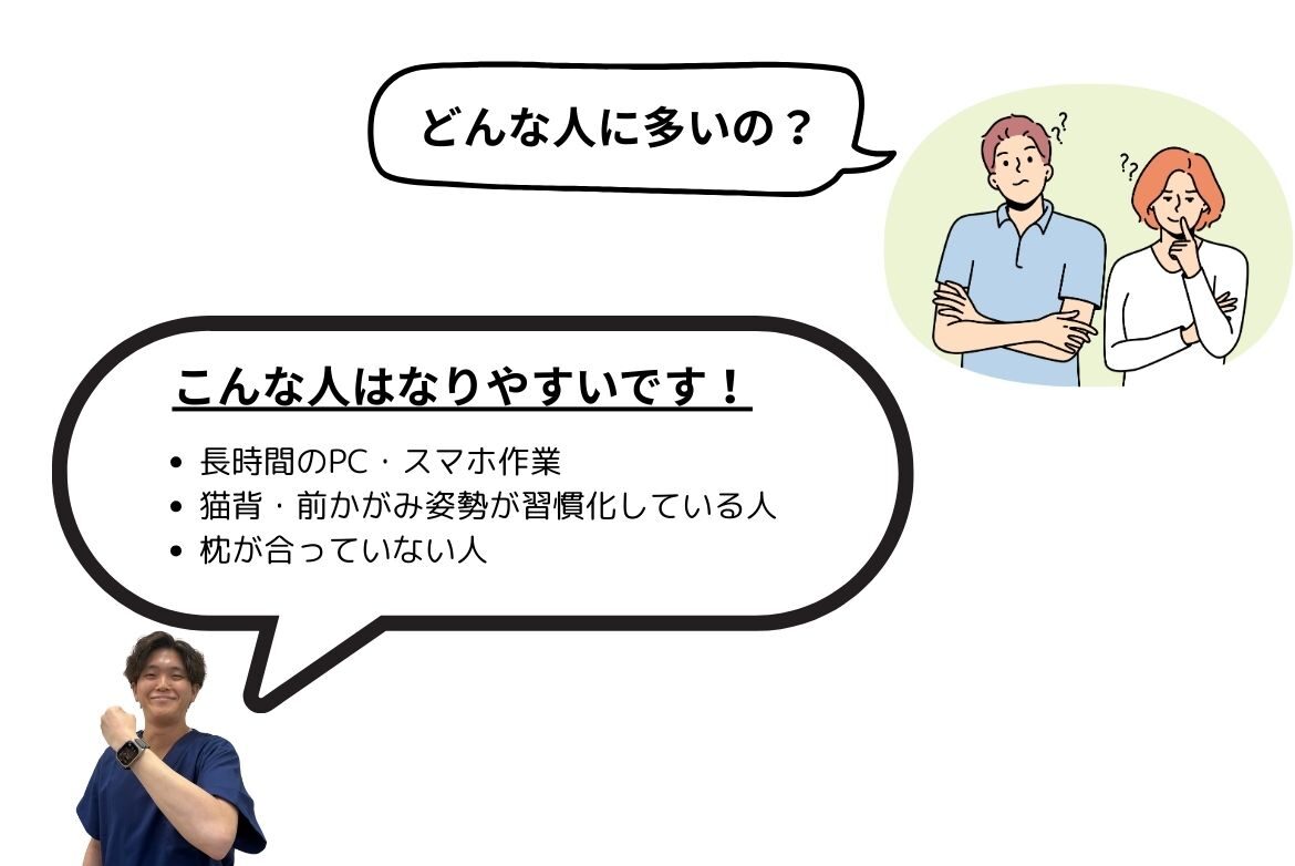 加齢や長年の姿勢不良によって首の骨が変形し、神経の出口(椎間孔)が狭くなることで神経根が圧迫されます。