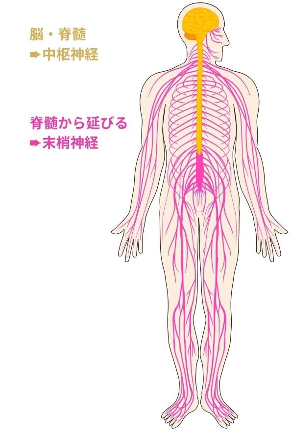 末梢神経:脊髄から枝分かれして、手足や皮膚、筋肉に伸びている神経