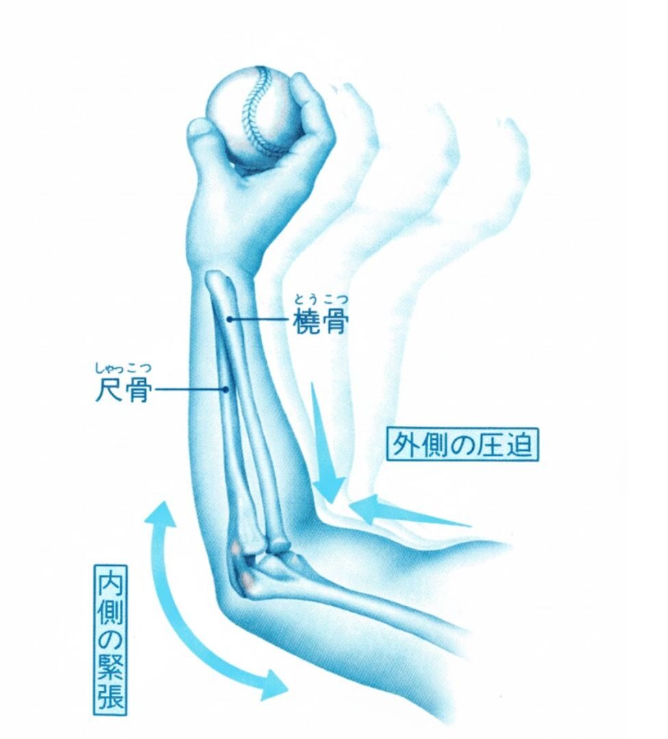 投球動作、特にボールを投げ終える「フォロースルー期」にかけて、肘の内側は引き伸ばされる(外反ストレス)一方で、肘の外側は、骨同士がガチッとぶつかり合うような強い「圧迫ストレス」を受けます。この圧迫力は、特に体が硬かったり、正しいフォームで投げられなかったりすると、さらに強くなります。